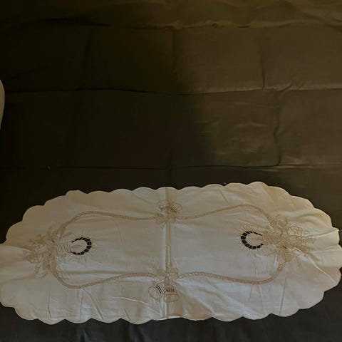 Denne bordløber er dekoreret med broderede julemotiver, herunder grangrene og stjerner. Kanterne er prydet med blå blondekanter, der tilføjer et dekorativt og festligt touch. Løberen måler 98x30 cm og vil være en ideel tilføjelse til julebordet.