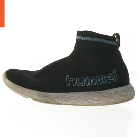Disse sko er i størrelse 34 og har et sporty design med velcrolukninger. Skoene er primært sorte med røde og blå detaljer og har en hvid gummisål med et mønstret blåt underlag. Skoene er mærket 'hummel' på siden og har et logo på hælen samt på sålen under skoen. Den kraftige sål giver god komfort og støtte til aktive børn.