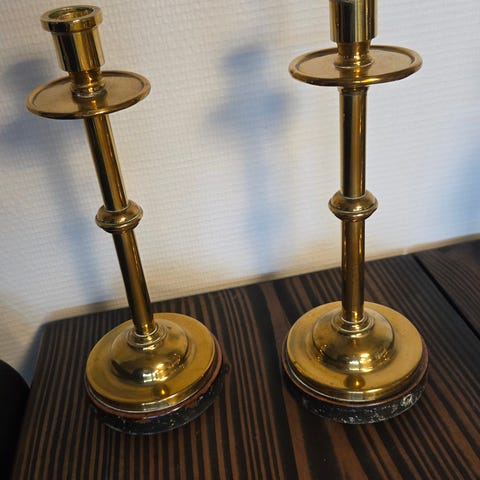 Et par messing lysestager med en klassisk, elegant design. De har en højde på 20 cm og en diameter på 9 cm ved bunden. Lysestagerne er lavet af metal og er konstrueret til at holde standard stearinlys. De har en rund base for stabilitet og en højde der gør dem velegnede både som borddekoration og som en del af de øvrige boligindretning. De skinnende messingfinish giver et tidløst look, som kan komplimentere forskellige indretningsstile. Tags: lysestager, messing, dekoration, klassisk