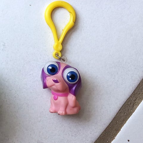 Denne nøglering har et vedhæng formet som en lille enhjørning. Vedhænget er lavet af glansfuldt, pink-farvet plastik. Nøgleringen har også et lille hjertevedhæng og en metal krog for nemt at fæstne den til en taske eller et bælte. Samlet længde er ca. 13 cm.