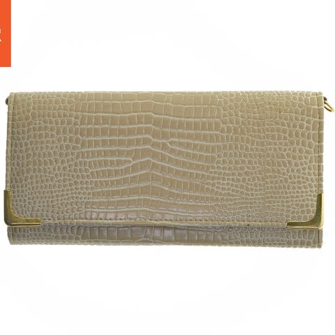 Denne clutch har dimensionerne 19x11,5 cm og er lavet af et blålakeret materiale. Tasken har en guldfarvet lynlås og beslag, samt en aftagelig håndledsrem, der gør det let at bære. Den har et enkelt, moderne design og passer til opbevaring af mindre personlige ejendele.