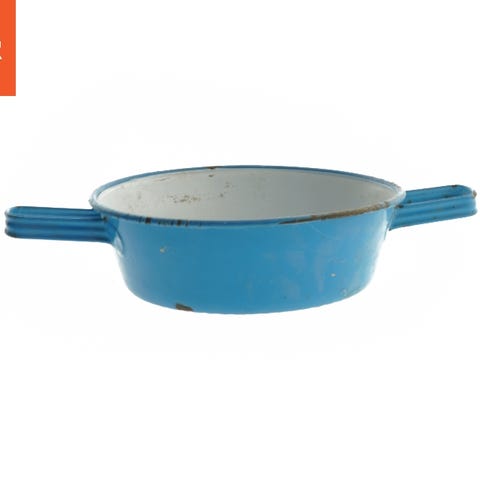 Denne vintage blå emaljesi er en klassisk køkkenredskab med en diameter på 18,5 cm. Den er udstyret med to håndtag for nem håndtering og har et perforeret design, som gør det ideelt til afdrypning af pasta, grøntsager og andre fødevarer. Overfladen viser tegn på alder og brug, hvilket giver den en rustik charme.