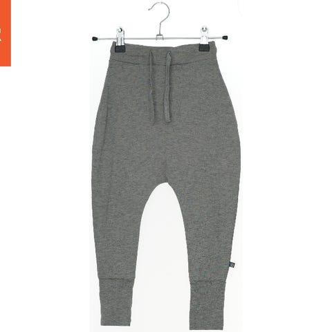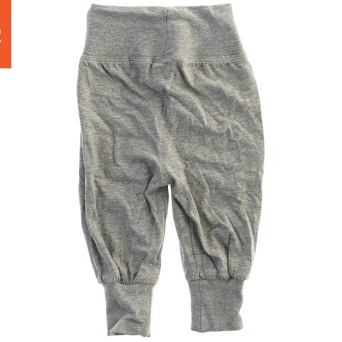 Bukser i grå farve, designet til babyer. Buksen har en elastisk talje og rib ved anklerne for komfortabel pasform. Stoffet er blødt og strækbart.