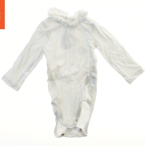 En hvid langærmet bodystocking med små prikker. Den har trykknapper på siden og i bunden for nem påklædning og gør det lettere at skifte ble. Designet er enkelt med en blød struktur.