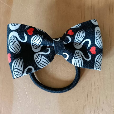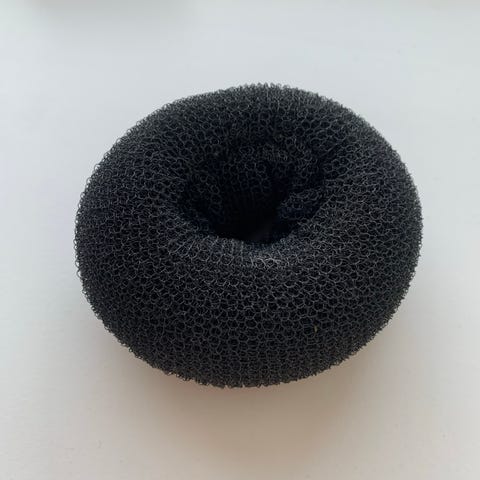 Sort hår donut lavet af nylon til at hjælpe med opsætning af håret i en knold. Produktet har en diameter på 9 cm og kommer i en gennemsigtig plastikemballage med en sort holder øverst til ophæng. Advarsler for små dele og egnethed for børn under 3 år er angivet på emballagen.