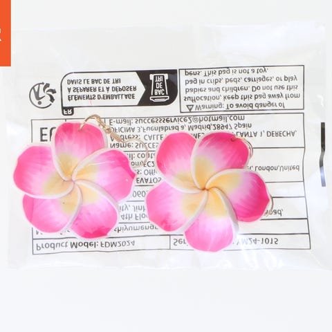Par ørestikker med blomsterdesign i hvidt og gult. De er pakker i en plastikpose med producentens oplysninger. Materialet ser ud til at være en form for let plast. Øreringene har guldfarvede kroge til montering. Modelnummer og serienummer er synlige på bagsiden af pakken.