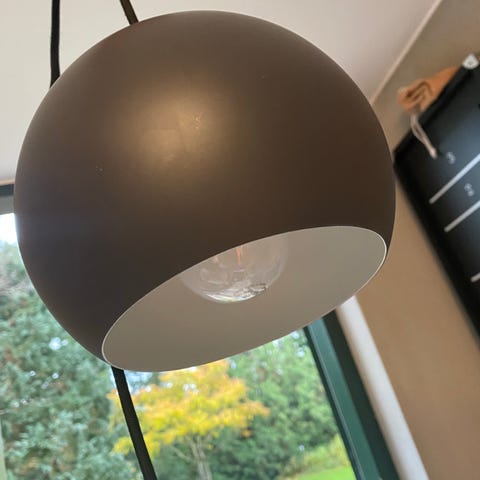 Fin Ball Pendel fra Frandsen Lighting. Denne sorte pendellampe har en rund form med en diameter på 18 cm. Den er udstyret med en ledning til ophængning. Lampen har små perforerede huller på toppen for mulig lysudslip. Det undersiden af lampen har en glat overflade i kontrastfarve.