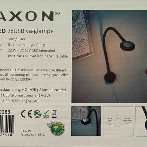 Raxon RL 27 LED 2xUSB væglampe i sort farve. Lampen er designet til vægmontering og har en fleksibel arm, der måler 51 cm. Den inkluderer integreret LED-belysning, samt USB-porte til opladning af smartphones og tablets. Lampen kommer i original emballage med installationsvejledning.