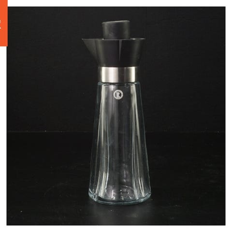 En glaskaraffel med et låg, som har en moderne og funktionel design. Låget ser ud til at være lavet af metal med en mat finish, mens selve karaflen er lavet af gennemsigtigt glas. Den har en højde på 26 cm og er egnet til servering af vand, juice eller andre drikkevarer.