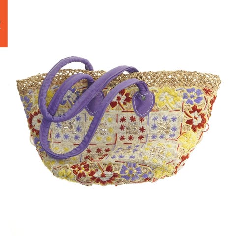 En taske lavet af stråmateriale med en indvendig stofbeklædning. Tasken er rektangulær og måler 29x19,5 cm. Den har en åbning med metalramme, der holder formen på tasken. Indersiden er beklædt med lyst stof, og der er små metaldetaljer til fastgørelse af en rem.