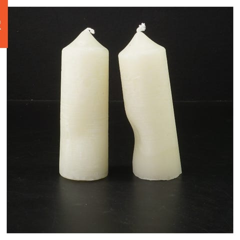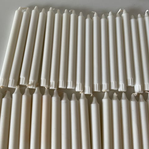Denne genstand består af to hvide stearinlys, hver med en højde på 15 cm. Lysene er bundet sammen med en snor. De har en klassisk cylindrisk form med en let spids top og en flad bund. Stearinlysene kan bruges til dekoration eller belysning.