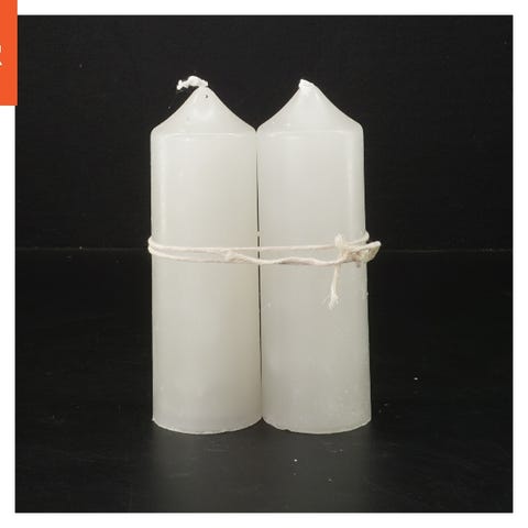 Sæt af to hvide stearinlys, hver 15 cm i højden. Lysene er bundet sammen med en orange elastik. De har en traditionel cylindrisk form med væger på toppen.