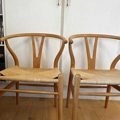 Carl Hansen spisebordsstol designet af Hans J. Wegner. Y-stolen er udført i træ med buet ryg og armlæn samt klassisk fletsæde.
