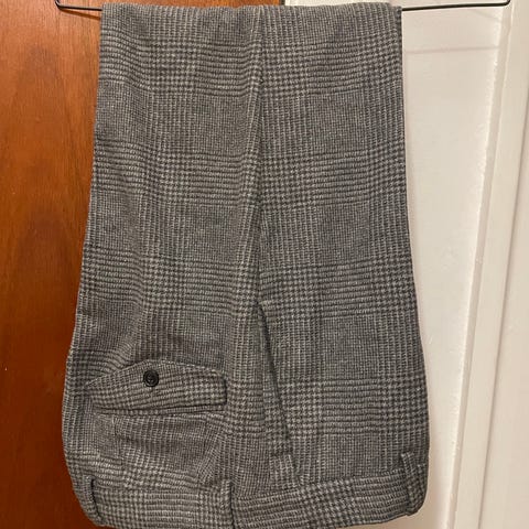 Billederne viser et par mørke bukser i størrelse 32, passende til aldrene 14-18 år. Bukserne har en knap og lynlås foran samt lommer foran og bagpå.