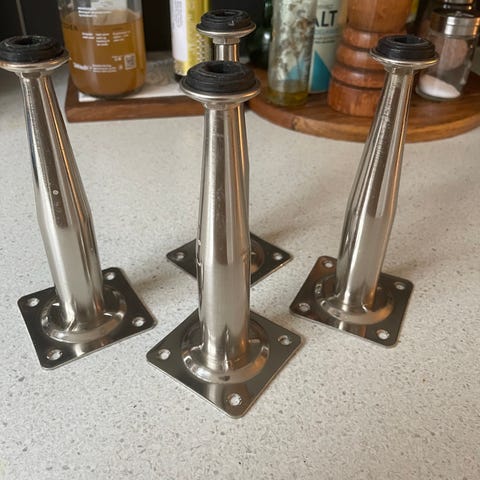 Sælges samlet. Nypris pr stk: 180kr. Bordbenet er fremstillet i forkromet metal og monteres ved hjælp af en monteringsplade og skruer. Hvis gulvet er ujævnt, kan benene justeres individuelt.