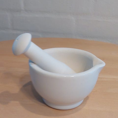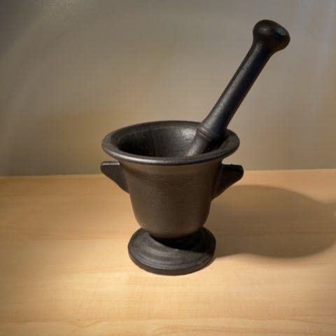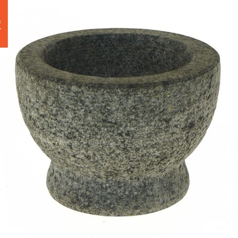 Støder til brug med en morter, lavet af solidt grå stenmateriale. Den er 17 cm langt og har en glat overflade, hvilket gør den velegnet til at knuse og male krydderier og andre små ingredienser i madlavning. Formen er afrundet og konisk, hvilket gør den nem at gribe og bruge i køkkenet.