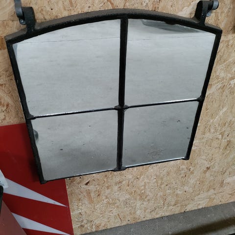 Staldvindue-spejl i lakeret støbejern i meget fin stand - ingen pletter i spejlene - og ingen rust på rammen.