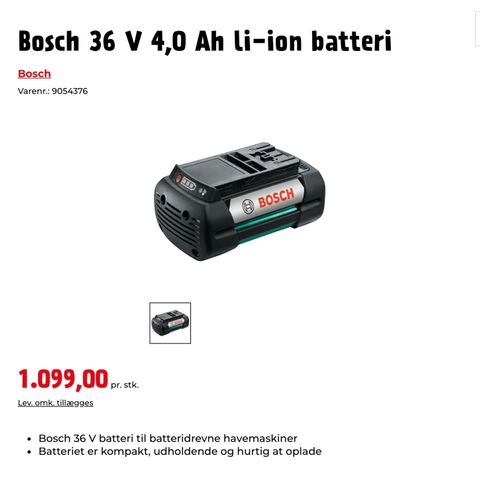 Batteri til Bosch 36V serien, med ekstra kapacitet på hele 4,0 Ah, gør at du kan anvende dine Bosch produkter længere. Batteritypen er af bedste kvalitet, hvilket giver kort opladningstid og inden selvafladning. Der er batteriniveau indikator på batteriet.