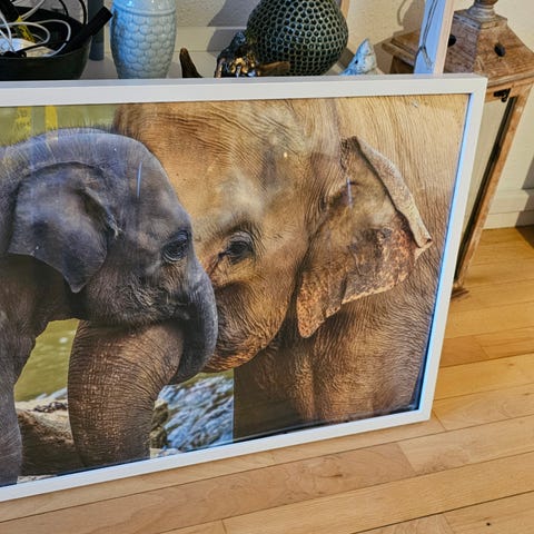 Vægkunst med motiv af elefant, monteret i ramme. Billedet viser elefantens hoved i blågrå nuancer med fokus på snabel og stødtænder. Leveres indrammet, klar til ophængning på væg i stue, kontor eller andre rum, hvor der ønskes et natur- og dyremotiv som dekoration.
