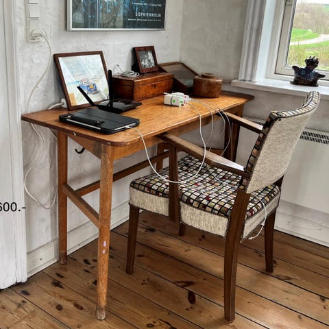 Original skolepult med tilhørende stol. Robust og funktionel.