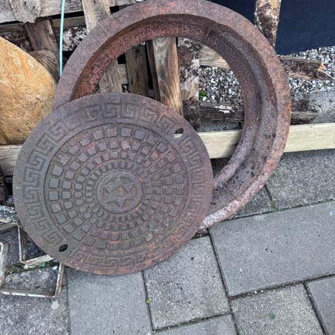 Kloakdæksel med tilhørende karm i støbejern. Firkantet ydre ramme med rundt dæksel. Velegnet til montering i belægning, fx fliser eller beton, hvor der er behov for adgang til kloak- eller inspektionsbrønd. Dækslet har greb/udskæring til løft og mønster i overfladen for skridsikkerhed. Sælges som komplet sæt med dæksel og karm.