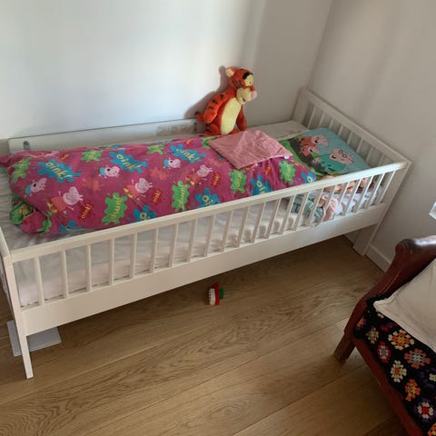 IKEA juniorseng i hvidmalet træ med lamelbund. Sengen er velegnet til børn, der er vokset ud af tremmesengen, og passer godt ind på børneværelset. Klassisk, enkel ramme med åbne gavle og plads under sengen til opbevaring efter behov.