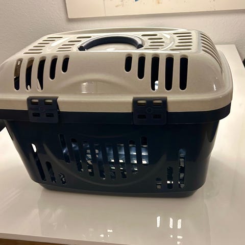 Transportkasse til kæledyr i hård plast i to grå nuancer. Kassen har metalgitter foran, ventilationsåbninger i siderne og bærehåndtag på toppen. Over- og underdel samles med kliklåse, så den kan skilles ad for nem rengøring. Velegnet til transport af mindre kæledyr som f.eks. kat eller lille hund i bil.