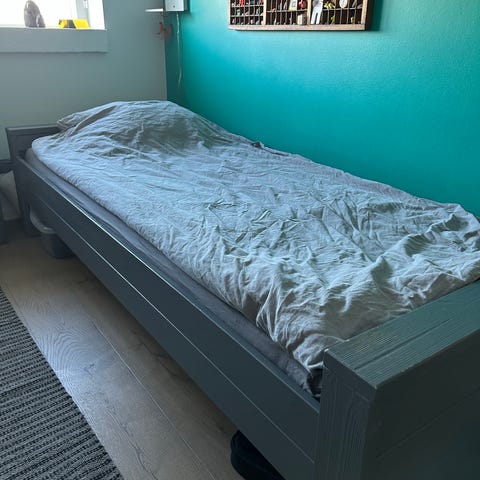 Seng inkl.madras bortgives. Madrassen måler 90x200 - selve sengerammen er 210cm lang.