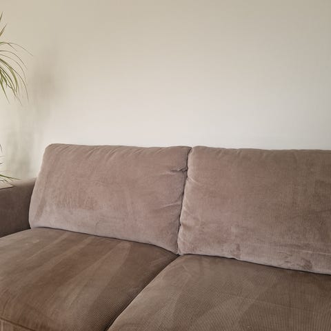 Sofaen er passet godt på, men har i den tid vi har haft den været igennem 3 flytninger (2021, 2023 og 2024), og der har den desværre fået et mindre brist i stoffet. Det er dog godt gemt væk bag den ene rygpude, og burde i øvrigt sagtens kunne syes hvis man ønsker det. Det har vi ikke selv fundet nødvendigt.