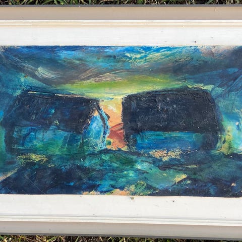 Egon Banke "Vintersol" Originalt maleri dateret 1991, signeret på forsiden. Motivet er et abstrakt vinterlandskab med sol i varme og mørke nuancer. Mål 30 x 21 cm