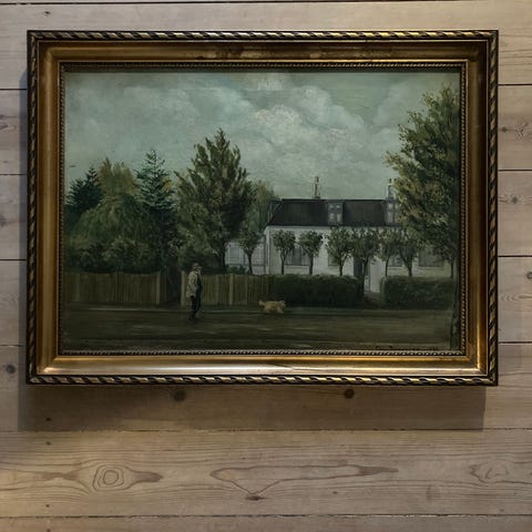 Oliemaleri, Munk, b: 82 h: 45, Stråtækt hus omkranset af træer, telefonmast og jordvej. Signeret Munk. I fornem forgyldt kraftig træramme. Mål på selve maleriet uden ramme: 45x29cm