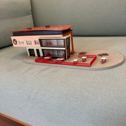 Modelhus med vandmølle til modeltogbane. Huset har rødt tegltag, grønne og pudsede vægge samt detaljer som hegn og vandhjul. Egnet som landskabselement på modeljernbane eller som dekoration i miniaturemiljøer. Materiale formodes at være plast