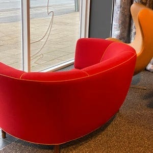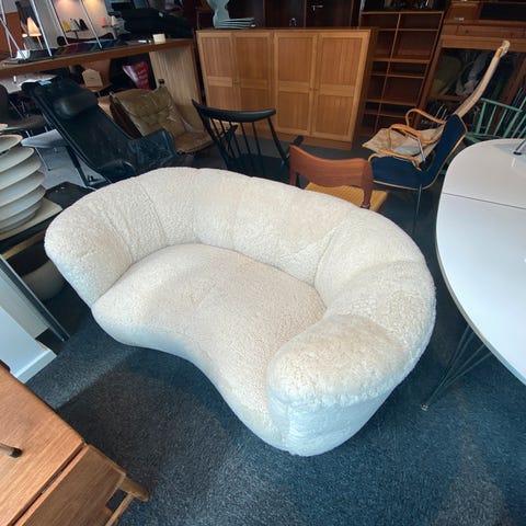 Stor Overpolstret banansofa i flot stand. Polstret i lammeuld “Natur”.