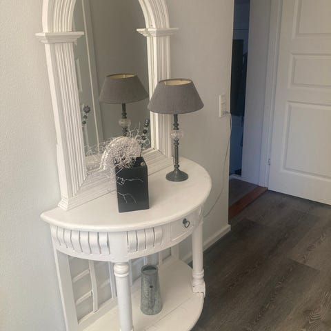 Hvidt skab kr. 200.- Hvid kommode kr. 200.- Spejl kr. 100.-
