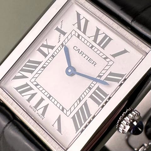 Uret måler 24x31 mm. Uret er i flot stand og kommer som et fuldt sæt på en ny brun læderrem. Oprindelig original cartier foldespænde medfølger.