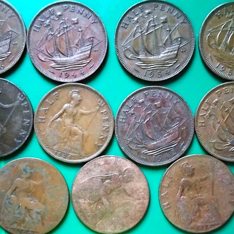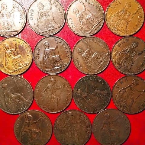 ENGLAND UK TWO SHILLINGS / FLORIN 1950, 1961 2 SLAGS! George VI & Elizabeth II + 2 NEW PENCE 1971 + 6 x 1 ONE PENNY 1971, 1986, 1994, 2005, 2005, 2010. Porto 25kr. Op til 100gram