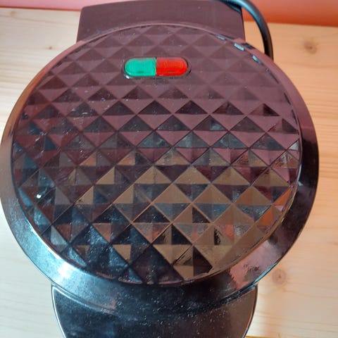 Melissa vaffeljern med rund bageplade. Apparatet har justerbar termostat på fronten samt indikatorlamper for strøm og klar til brug. Ydersiden er rød med sort håndtag og top. Bagepladerne er belagt med slip-let belægning og er runde, velegnet til tilberedning af vafler eller lignende dejprodukter. Enheden tilsluttes med almindelig netledning.