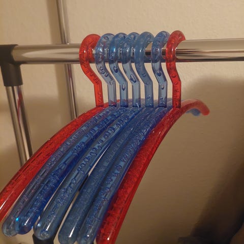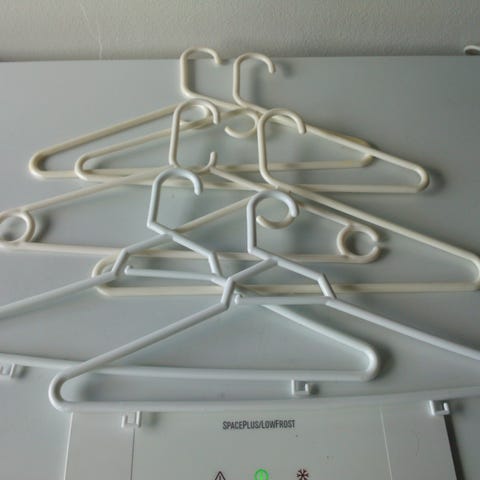 Hver bøjle har metal krog og er betrukket med plast i forskellige farver og mønstre.