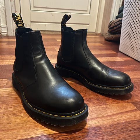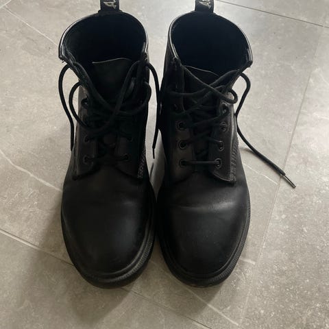 Dr. Martens Weston støvler i størrelse 43. Støvlerne er i sort læder med klassiske gule syninger og hælstrop med AirWair-tekst. Modellen har snørelukning med både almindelige snørehuller og kroge øverst. Indvendigt er der ternet for. Skoene har den karakteristiske Dr. Martens sål med god støtte. Velegnet som hverdagssko eller til brug i køligere vejr.