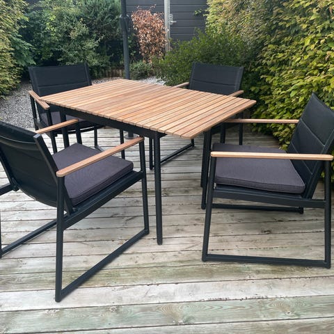 Havebord med rektangulær plade og sorte metalben samt tilhørende 4 kurvestole i gråt flet med lyse hynder. Bordet har en lysegrå bordplade, og stolene har høj ryg og armlæn. Stole er i raftan og lette at vedligeholde. 4 grå hynder medfølger.