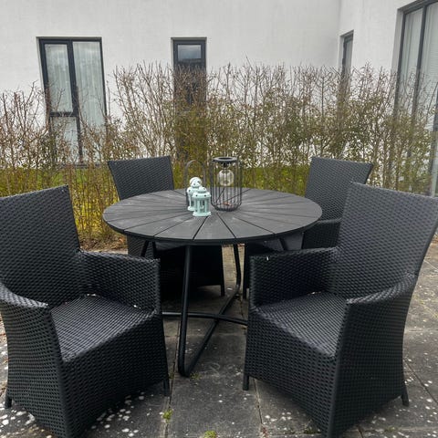 Polyrattanmaterialet er flettet i en grålig tone, egnet til brug på terrasse, altan eller i haven.