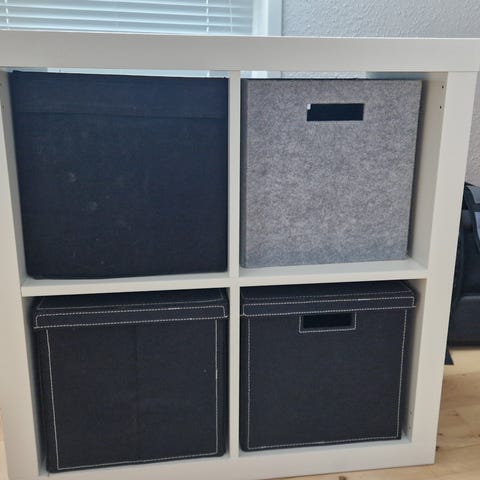 Kallax med 10 indsatser og 10 plast kasser. Som ny.