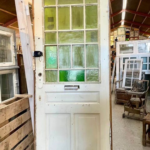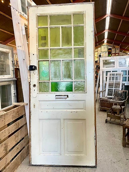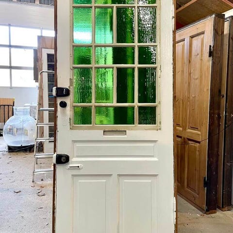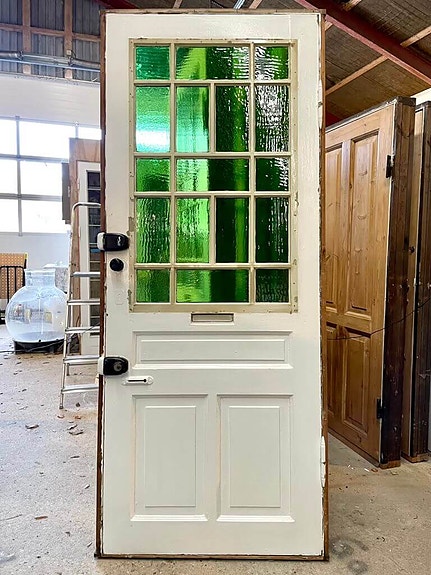Smuk og klassisk opgangsdør fra ejendom på Frederiksberg opført i 1905. Med stort glasparti med kittede ruder af grønt råglas samt smukke fyldninger nederst.