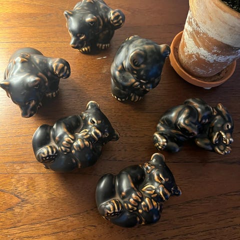 6 royal Copenhagen Knud kyhn figurer. 2 bjørne nr 21433 og 3 bjørn 21434 og 1 abe 20187 alle er 1 sort og i pæn stand se billederne som er en del af beskrivelsen