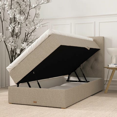Venstre side af Boxseng uden gavl med opbevaring i størrelsen 90x200 cm. Sengen har løftemekanisme, så madrassen kan vippes op og giver adgang til opbevaringsrum under madrassen. Farven er sand/beige. Der er en fejl under sengen, men den virker helt som den skal og sælges derfor billigt.