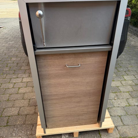 Affaldssorteringsmodul med 3 separate rum til affaldssortering. Enheden er fremstillet i metal og er i en mørkegrå farve. Toppen har tre åbninger med låg, hvor to er firkantede og et er rektangulært. Bag de tre fronter er der plads til indvendige beholdere eller sække til forskellige affaldstyper. Velegnet til kontor, kantine, fællesarealer eller hjem, hvor der ønskes systematisk sortering af affald i én samlet enhed. Mærke Bica. Nypris 8000kr