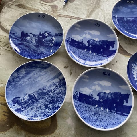 Bing & Grøndahl juleplatter i porcelæn med blå-hvide motiver. Platterne viser forskellige julescener, blandt andet vinterlandskaber, familie omkring klaver og hus i sne. Årstal som 1970, 1971, 1972 og 1973 fremgår på nogle af platterne. Velegnet som samlerobjekter eller vægdekoration i juletiden. Platterne har klassisk rund form og ophængningshuller på bagsiden på de fleste modeller.