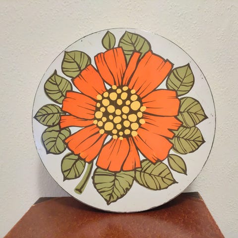 " Gammel" kagedåse fra 1970'erne,rund kagedåse med pink blomster; blomstret retro kagedåse ( Ø 22-H 10 cm ) med almene små brugsspor,se/ hent pink kagedåse med blomster i Esbjerg Midtby, sendes gerne