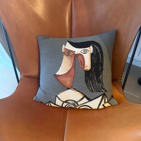 Fint lakeret træfad. Motiv "Kvinde i en rød lænestol" af Pablo Picasso. Sort på bagsiden, med mulighed for ophængning