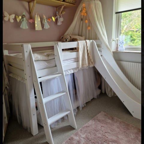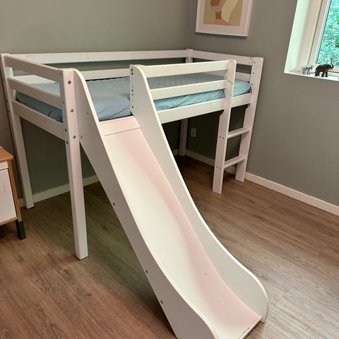 Hoppekids eco Dream halvhøj seng med hvidt stel og rutsjebane inkl. madras.